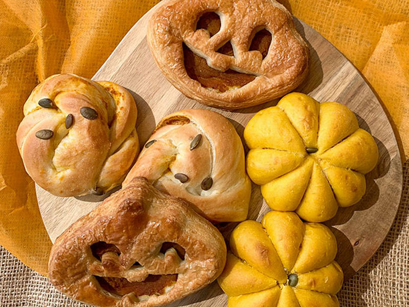 生地を成形してハロウィンにぴったりのパンを作る教室です。楽しいカタチの「かぼちゃデニッシュ」と「かぼちゃフィリングパン」を作ります。