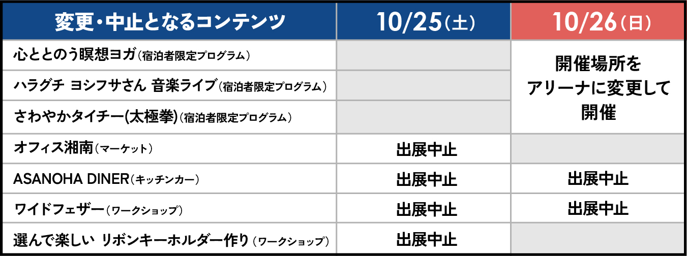 また、天候や安全面を考慮し、誠に残念ながら、下記のコンテンツは変更・中止することとなりました。