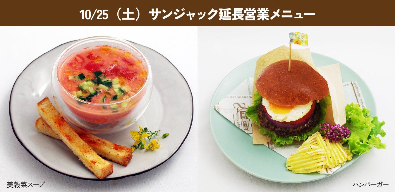 25日(土)は、カフェサンジャックが20:00まで営業時間を延長!16:30-20:00の間は美穀菜スープやハンバーガー、焼きうどん、ギザギザポテトなど通常提供していない特別メニューを販売いたします。サンジャックで素敵な秋の夜をお過ごしください。